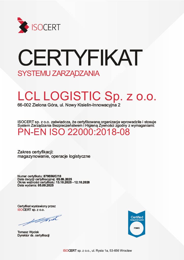 Um die höchste Qualität unserer Produkte und die Sicherheit unserer Kunden zu gewährleisten, sind wir nach ISO 22000 zertifiziert. Diese Norm bezieht sich auf die Lebensmittelsicherheit und stellt sicher, dass unsere Lagerungsprozesse den höchsten Standards entsprechen.